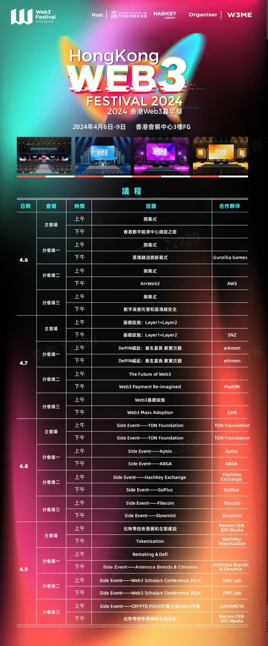 Side Event伙伴:ABGA,Animoca Brands & Chromia、Aptos、DRK Lab、UOVABOX、Filecoin Foundation.GoPlus、Hashkey Exchange、SlowMist、 TON Foundation