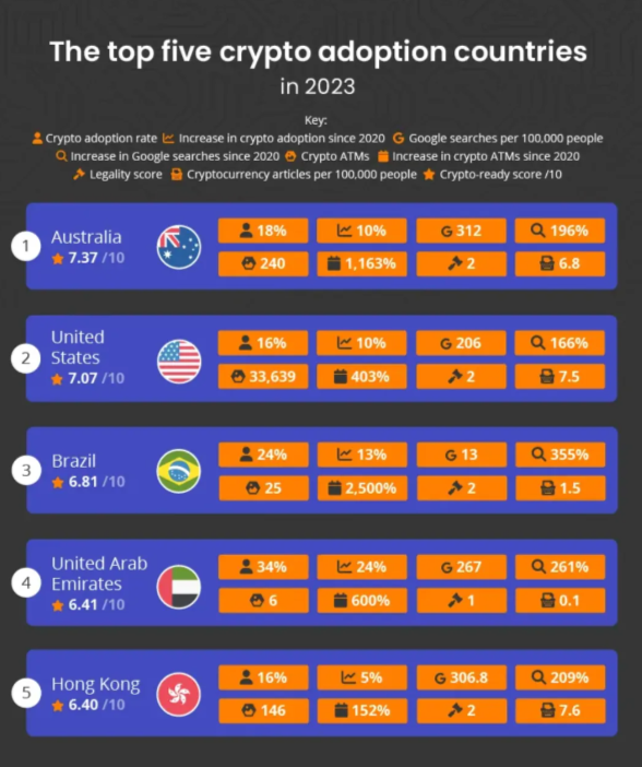 在Finder的一份加密货币采用率报告中,亚洲区域香港的加密货币采用率最高,全球排名Top5。其中,2022年的加密货币采用率为16%,对加密货币的搜索增加了209%,同时每10万人发布了7.6篇与加密货币相关的文章, 加密货币自动柜员机增加了152%。
