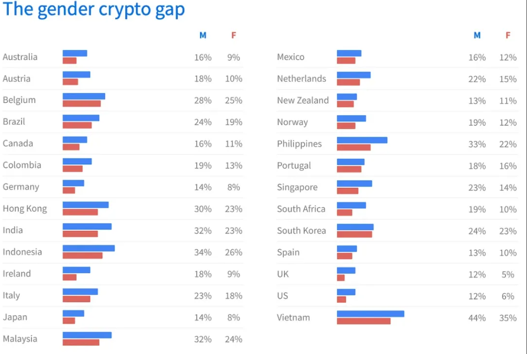 从性别维度看,香港与全球趋势一致,加密用户人群中男性比女性更多,在香港持有加密货币的男性占30%,而女性的比例为23%。主要原因是男性的收入相对更高,以及男性对加密和Web3的兴趣更为浓厚。