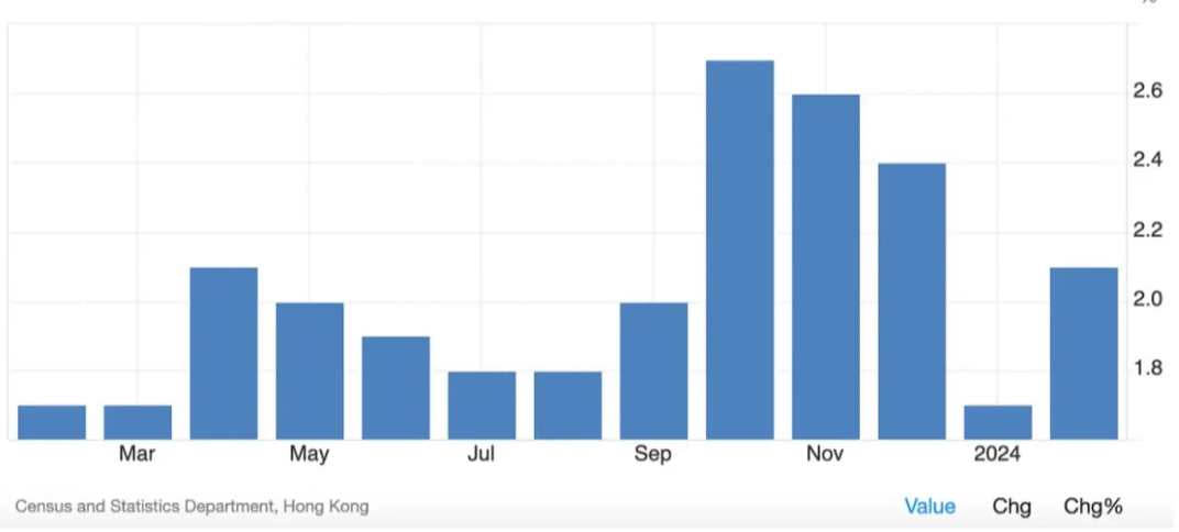 2024年2月,香港的年通货膨胀率上升至2.1%,略低于市场预期的2.2%。食品(2.2%)、住房(3%)、交通(2.3%)和其他服务(3.6%)的价格上涨,而服装和鞋类(1.3%)以及其他商品(1%)的价格则有所放缓。电力、煤气和水费(-7.8%)以及耐用品(-1.4%)的成本继续下降。核心通胀率与之前的0.8%相比也增加至1.2%。香港政府表示,今年前两个月基本消费物价通胀率维持温和。尽管外出用膳及外卖价格继续录得相对快的升幅,基本食品价格按年下跌,能源相关项目价格进一步向下,其他主要组成项目承受的价格压力仍然大致受控。尽管本地成本或会随着经济继续增长而面对一些上升压力,外围价格压力应会进一步缓和。