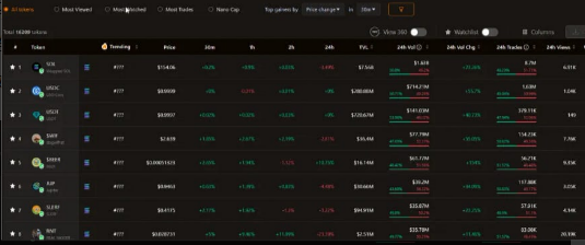 Birdeye 也是一个多链聚合器,功能上和 DEX Screener 比较类似,除了能够査看各链代币的实时交易+K 线+ 代而持有信息等数据外,也是寻找 Gems 比较好用的一个工具。如下图所示。