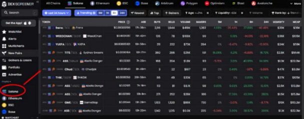 DEX Screener 是一个多链聚合器,可以用来跟踪和分析来自多个去中心化交易所(DEX)的实时数据,同时我们还能够查看任意代币的价格图表(K线图)、监控最新上线的交易对,追踪具体代币的持币人数据等等。如下图所示。