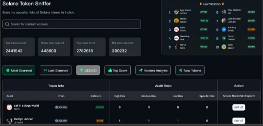 solsniffer 是 Solana 上的一个代币探器工具,该工县允许用户基于多个安全指标检测 Solana 代币的安全风险包括铸币风险、冻结风险、流动性检查、等等。如下图所示。