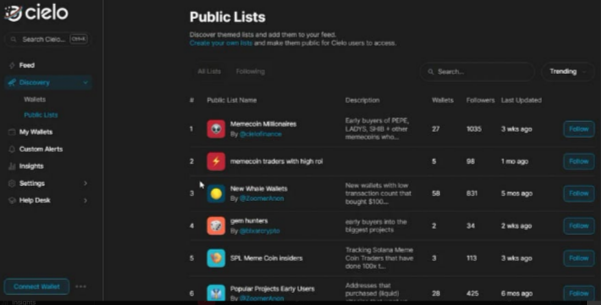 Cielo 是一个链上活动的聚合器,可以用来跟踪你最喜欢的交易者的钱包地址,并在他们发生交易的时候实时跟踪和监控(支持设置警报)他们的交易。该工具能够跟踪多达250 个钱包,并提供对 Smart Money 和Alpha Walet的洞察。如下图所示。
