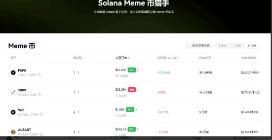 Meme 而猎手是 OKX 推出的一款钱包小工具,能够全网监测 Solana 链上信息,实时更新聪明钱兑换 meme 而的动态,以此来为用户提供一定的洞察机会。如下图所示。