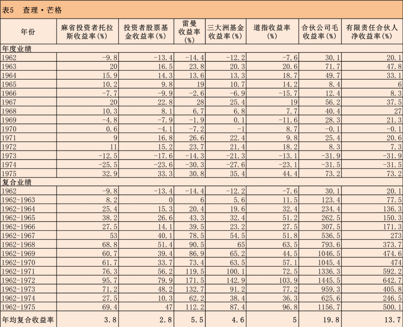表5是我的一个朋友的投资纪录,他毕业于哈佛大学法学院,曾开过一家颇具规模的法律事务所。1960年前后,我与其相识并告诉他,法律是一种很好的业余爱好,但他还可以做得更好。他按照与沃尔特完全相反的做法,建立了一家合伙企业。