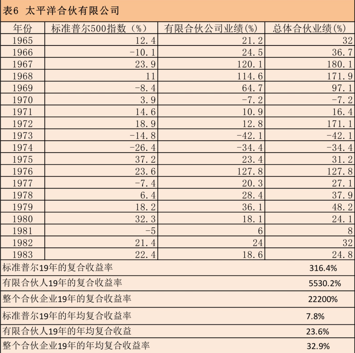 表6是里克·格林的投资记录。他是查理的一个朋友,毕业于USC数学系(又一个不是商学院出身的例子),曾进入IBM从事销售工作。在我劝说查理后,查理又劝说他。从1965到1983年,相对于S&P指数的316%回酬,他取得了约22,200%的总回酬。