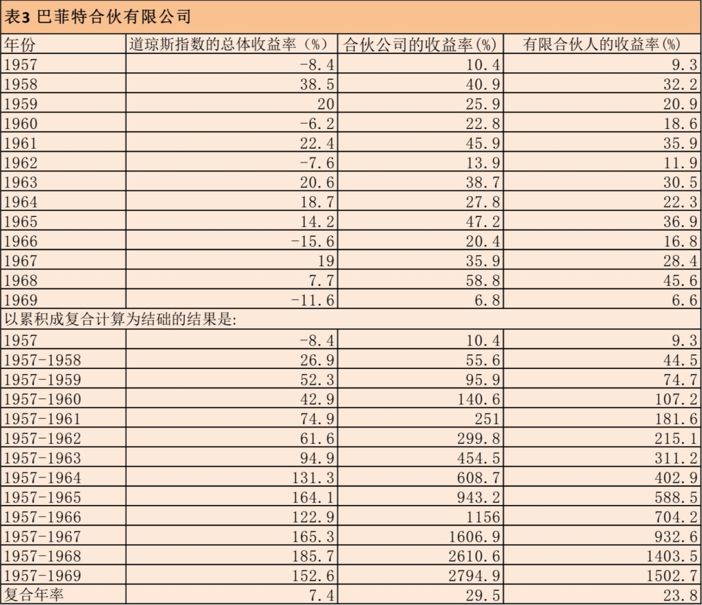 表3是第三个成员的投资成绩,他在1957年成立了巴菲特合伙企业。在1969年过后,他解散了公司。虽然从那以后,他仍通过伯克希尔——哈撒韦继续他的投资事业,但是我找不到一个很好的标准参数来表达伯克希尔的投资成果。不过我认为,不管从是从哪一方面来衡量,它的成绩都是相当令人满意的。