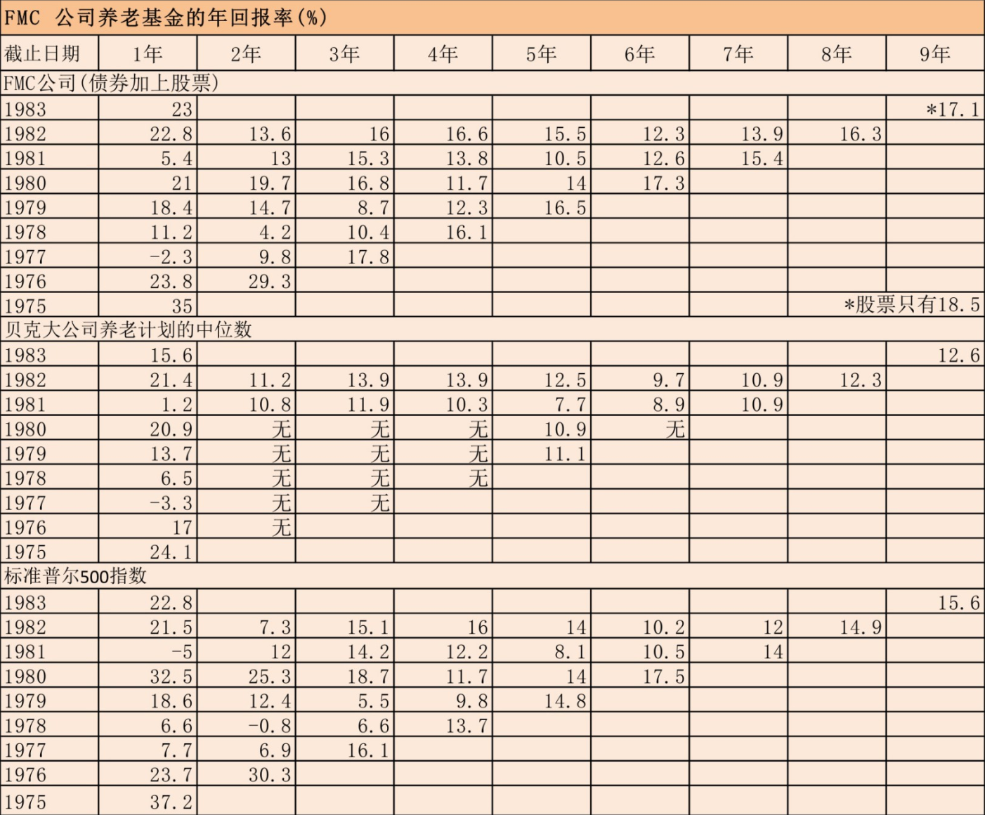 表9是FMC公司的退休基金。我从来没有亲自管理过这个基金,但曾在1974年影响了他们的决定,挑选价值型的基金经理来管理它。在那之前,他们挑选基金经理的方式与其他大公司没有什么不同。今天,由于那次“转型”,在贝克(Becker)一项关于退休基金的调查中,它已是规模最大的基金了。去年,他们共有8位基金经理;其中的7位的累计回酬比S&P的表现还好,全部8人在去年都取得了比S&P还好的回酬。在这段时间内,FMC基金的总回酬比其他基金的平均表现总共多出了2.43亿美元。FMC把这项成就归功于他们在挑选基金经理时的信念。那些经理不一定都是我会挑选的,但他们都有个共同点:根据价值来选择所投资的股票。