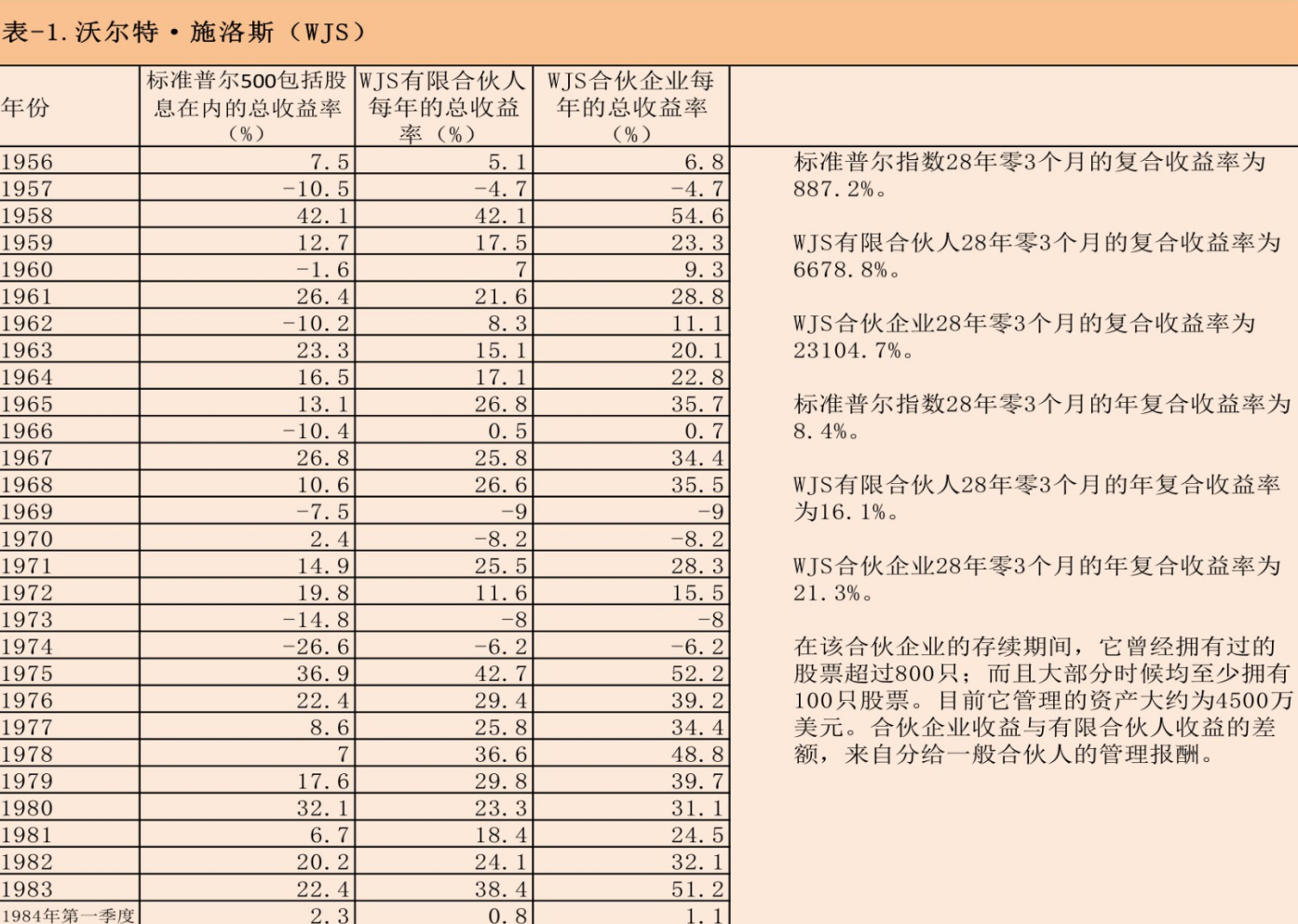 首先,我们来看沃尔特·施洛斯(Walter Schloss)。沃尔特从未上过大学,但参加格雷厄姆在纽约金融学院举办的夜校。沃尔特于1955年离开格雷厄姆——纽曼公司,并在28年间取得了表1所示的投资业绩。听了我所介绍的关于沃尔特的事迹后,“亚当·斯密”在1972年出版的《Supermoney》,写了一篇有关沃尔特的报道以下,是这篇文章中对沃尔特的评论: