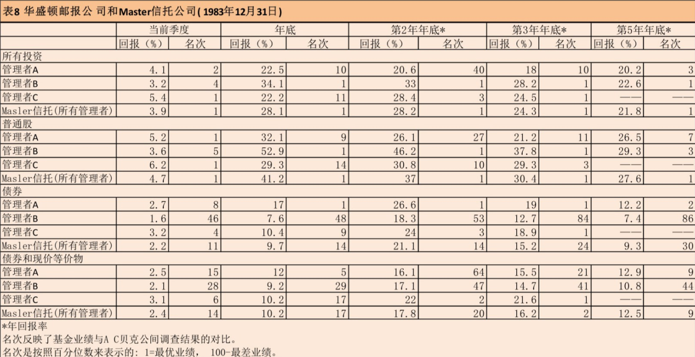 如你所见,他们的总体成绩一直以来都在同行中取得极高的排名。华盛顿邮报公司要求这些经理们至少保留25%的资金在债券投资中。我在表8中也列出了他们在债券投资方面的成绩,是为了让大家知道,他们在债券方面并不在行。他们本身也是这么认为的。即使受到了这25%(投资于他们所不熟悉的债券)的拖累,他们的投资成绩仍然在基金管理方面名列前茅。虽然这个基金的记录所涵盖的期限不是很长,但它代表了三个基金经理的许多投资决定。虽然这些人过去并不为人所知。