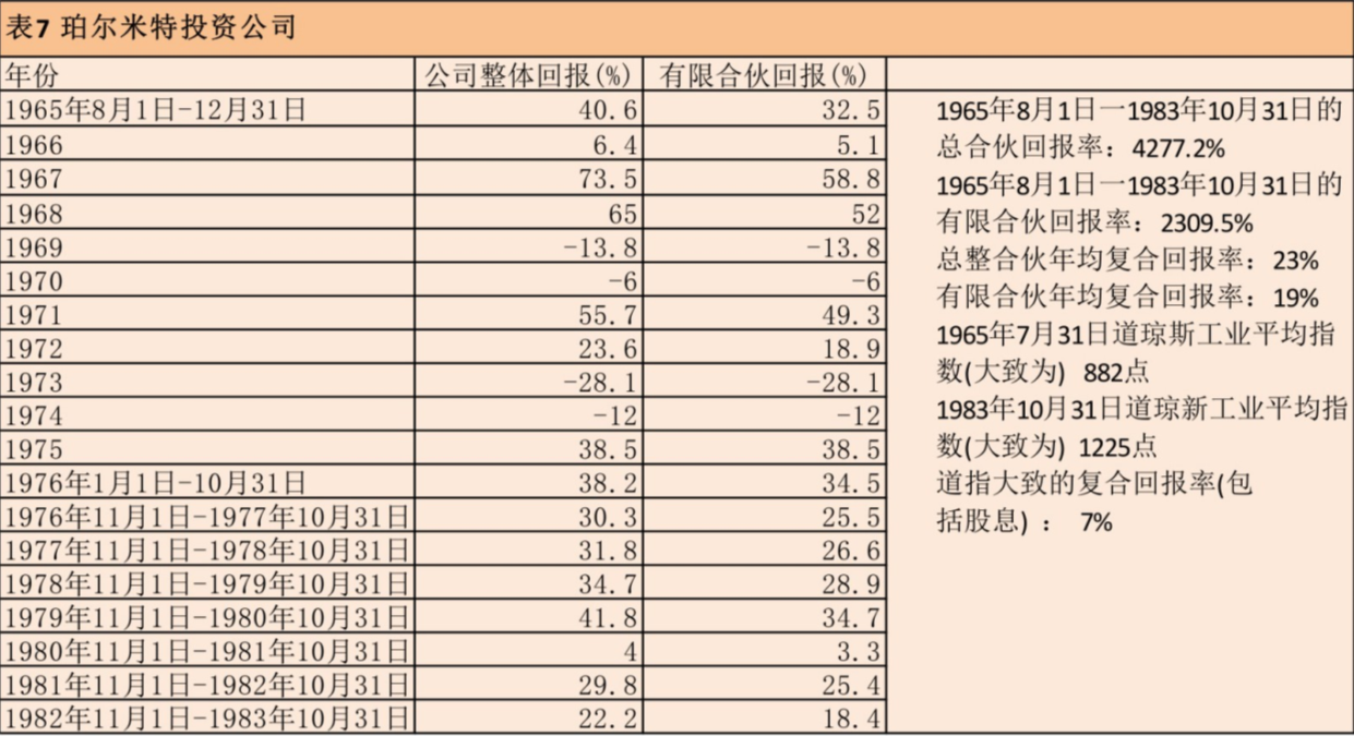 表7是斯坦·帕尔米特的记录。他是密之根大学的文科生,毕业后成了Bozell& Jacobs广告代理的一个事业伙伴。我们曾在Omaha的同一座公寓里居住。1965年,他发现我的生意比他的还赚钱,就离开了他的广告代理事业。同样的,斯坦只用了5分钟,就接受了价值投资法。