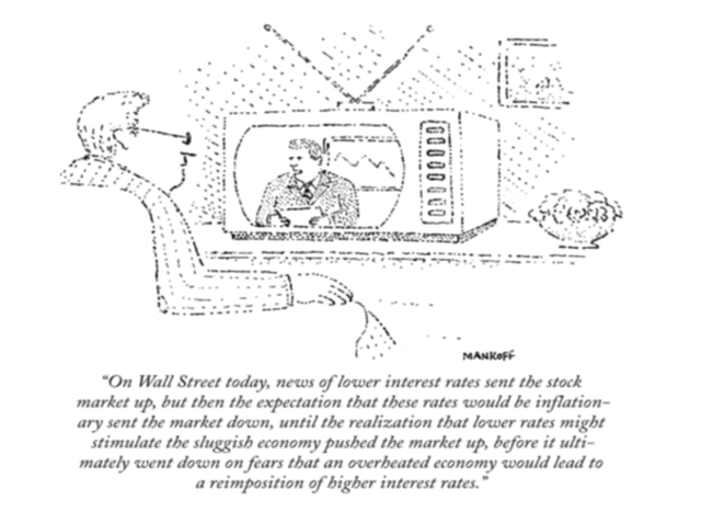 投资者能够对几乎任意一条新闻进行解读,正面还是负面取决于报道方式和他们的心情,这是关键所在。(下面的漫画,我一直以来的最爱之一,是几十年前出版的,看看那些天线和电视机柜的深度,但显而易见,文字说明才与这一刻的主题有关。)