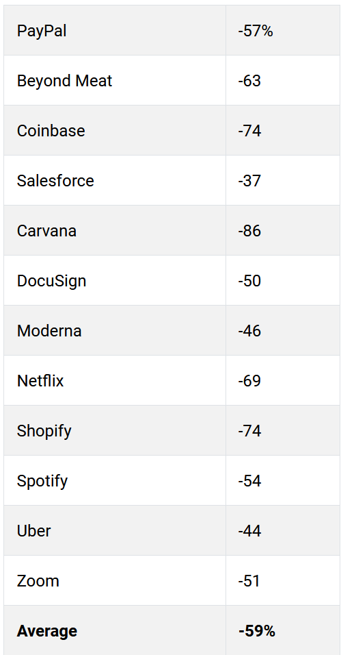 以下是我随机挑选的一些知名科技、数字货币和创新型股票的跌幅。也许,当这里的一些股票处于巅峰的时候,你因为没有入手而感到自责: