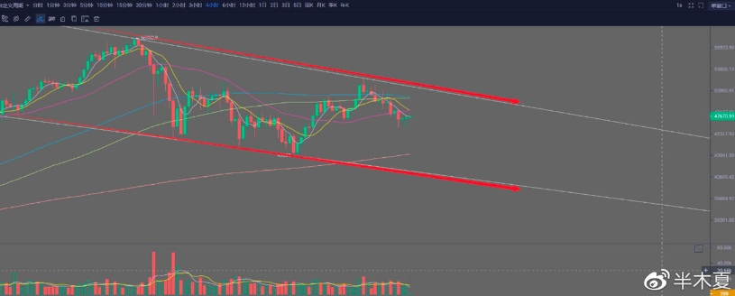 说到止损,之前定的是54000,因为行情实在是偏空,所以当时定的位置较高。现在可以把止损位放在成本价位置,或者趋势上沿,目前来看是51000,并且随着时间推移不断降低。所以这一单空单怎么也不会亏了。