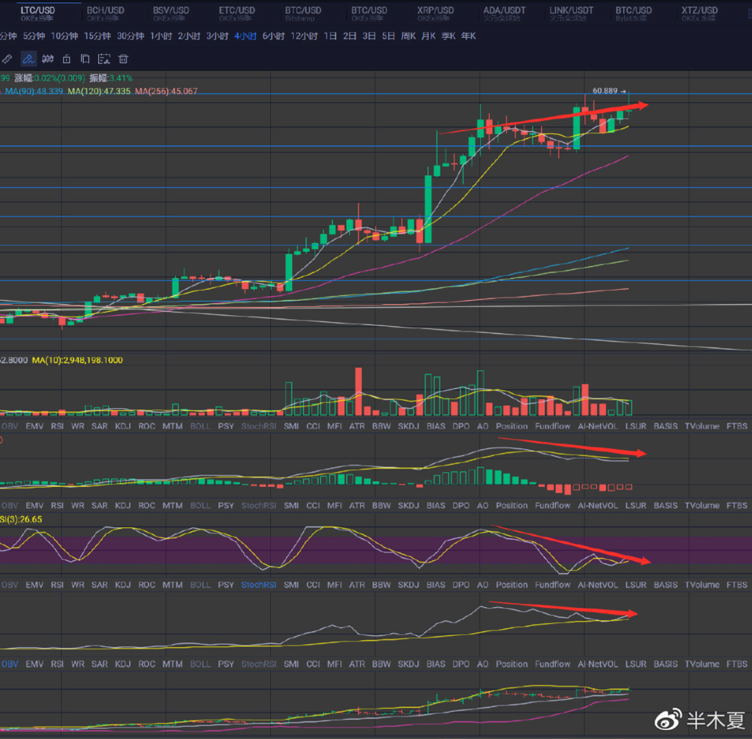 4h走出了比较明显的顶背离,多头趋势中出现这种情况,确实不少时候会无视顶背离继续拉,但是在这样明显的风险面前,至少是要止盈部分多单的。我当时的选择是平掉所有多单,并在LTC季度59.5左右做了0.5倍空(实际净多0.5倍,满仓现货自带1倍多)。以太的持仓太小,几乎忽略,应该是350左右做的空,后来爆仓止损的。