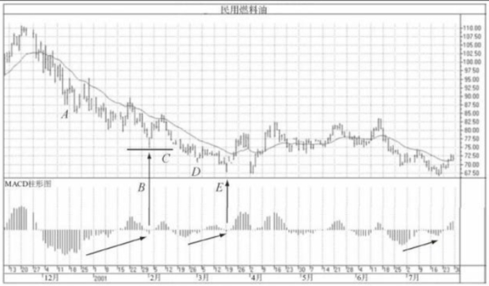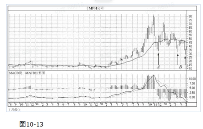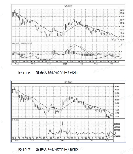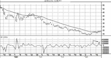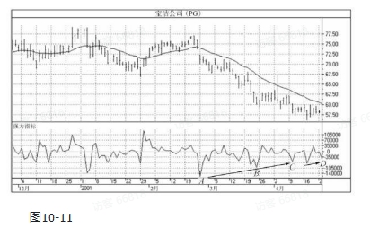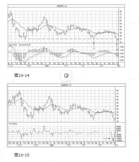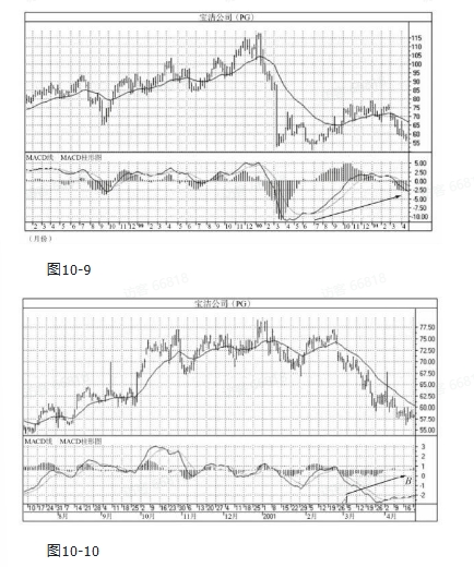 周线图 如图10-9所示,股价下跌,但遇到支撑:周线图上MACD 柱形图即将完成底背离形态,且大盘正在上扬。 日线图 如图10-10和图10-11所示,AB的区间上,MACD柱形图 的第二个底部B非常之浅,表明空方乏力, 由此呈现底背离形态,没有 一个强大的做空压力:自2月以来,2日强力指标在ABCD区间呈 现两次长期底背离形态,在图形右端的C~D区间出现一次较短期的底 背离形态,此时做多的最后指令。预期价格反弹,升至指数均线之上,其线上距离至少和线下距离相等。