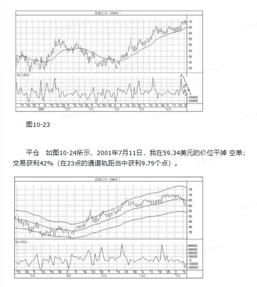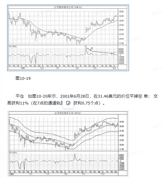 平仓 如图10-4所示,2001年4月20日,我在18.85美元的价位卖出平仓。交易获利55%(在9点的通道轨距当中获利4.94个点)。