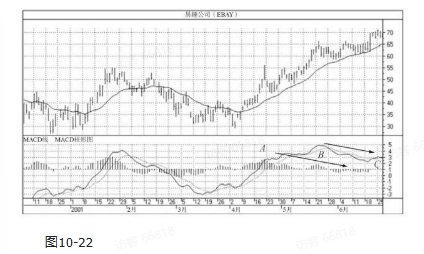 日线图 如图10-22和图10-23所示,日线图上的ABC区间MACD柱形图和价格走势呈现强烈的顶背离状态;在BC区间MACD线也罕见地显示出顶背离的状态:图形右端,强力指标和价格走 势在AB~C区间上,显示出三重顶背离状态。这样,一个卖出的信号 就出现了; 此时要有做空的计划,并设置安全区域止损。