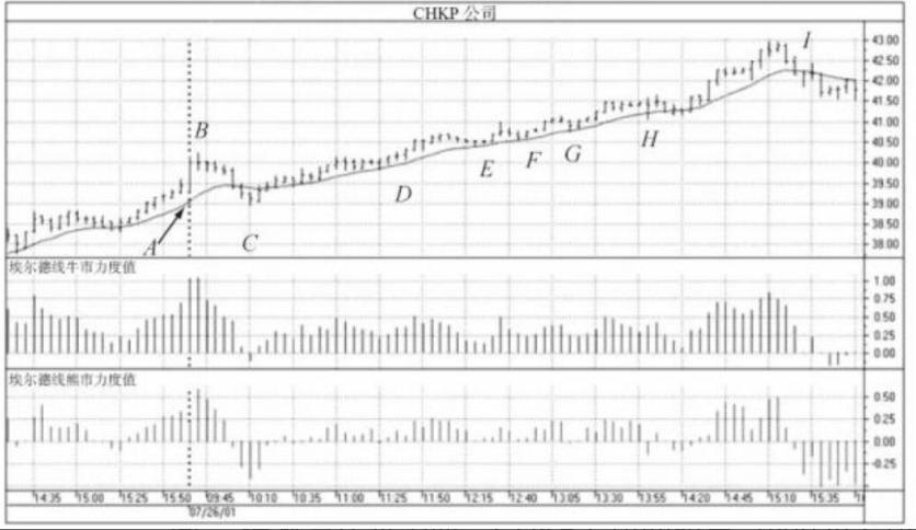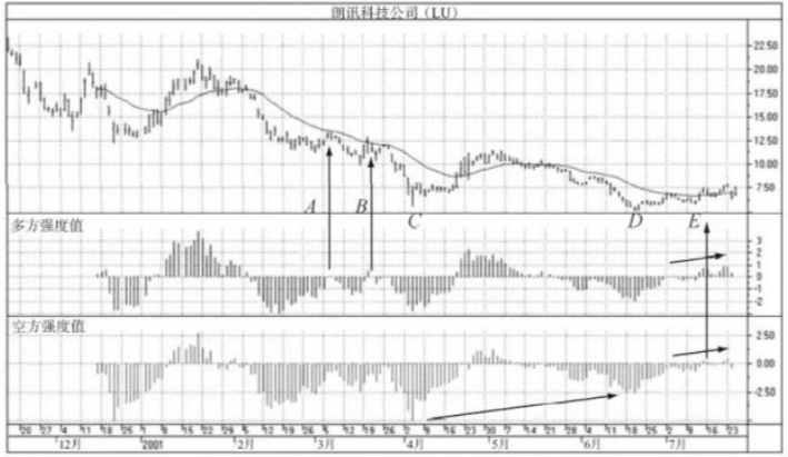 (见图10-6和图10-7)AB的区间上,MACD柱形图与价格 走势呈现底背离形态,表明空方势力减弱,价格下跌属于惯性所致,没 有一个强大的做空压力: 几个交易日之前,存在一个穿透10美元价位的 假破,最右端的柱形正在下探,意欲重新验证这个心理支撑位: 前一周 破位而形成的底部提供出一个逻辑上的止损价位:2日强力指标在AB~C区间呈现三重底背离形态,表明空方乏力此时可以做多,预期价 格反弹,升至指数均线之上。