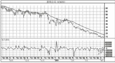 周线图 如图10-1所示,思科公司的股价已经折损85%,但这家公司不会像其他那些".com"一类的小企业那样破产、消失。 从周线图上看 --其交易区间已经变得很窄; 接近右端的价格波动幅度只有几美元,一年之前还是10美元,此状态表明这只股票包含的投机因素已然消失:在周线图的右端,MACD柱形图6周之中持续上涨,显示出牛市行情: 价格走势远在其指数均线以下,与2000年的均线之上的顶部价位相比,距离相当;连接价格曲线与指数均线的“橡皮筋"已经被过度拉伸,即将 弹回。