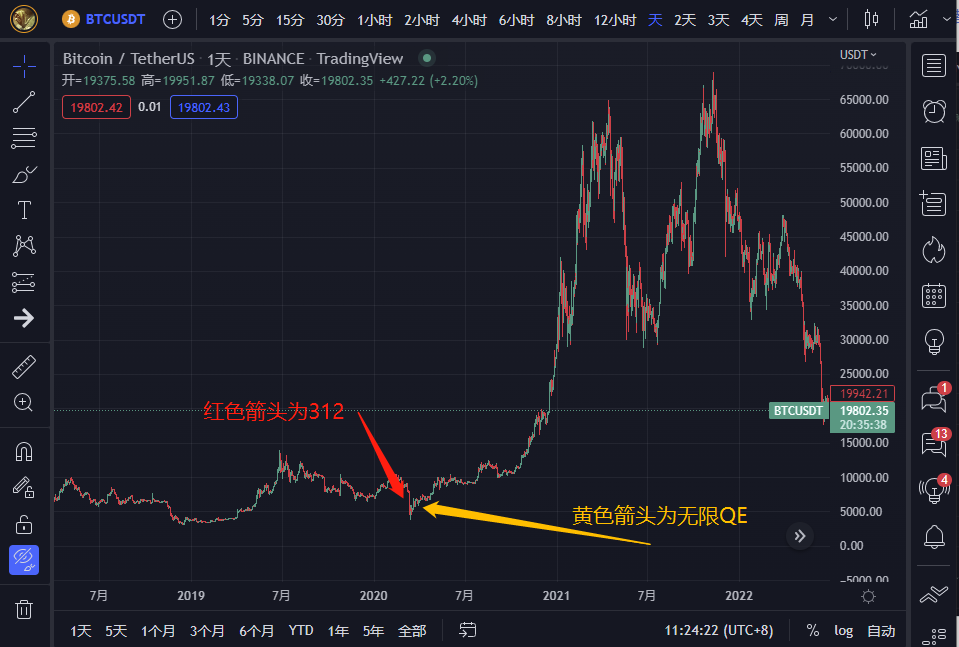 但这时,美联储出手了,于当年3月23日开启了无限量QE,即“市场要多少钱,美联储就给多少钱”,在那之后,美股和币圈顶着恐惧情绪,开启了持续的上涨,开启了史无前例的大牛市。(无限量QE可参考新浪网专题《如何看美联储的无限量QE?你想知道的都在这里》