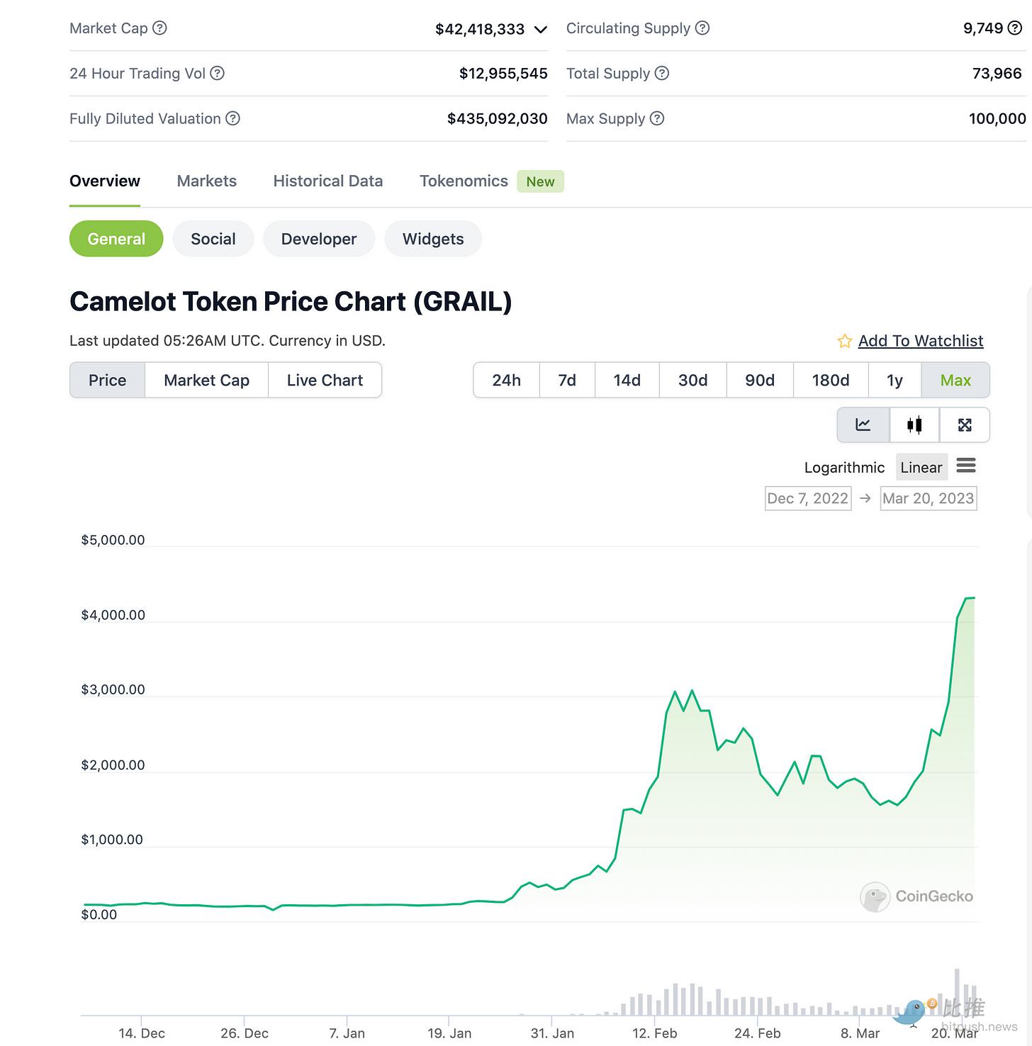 同样的例子,还是ARB上的DEX Camelot,我们发现估值也是4.3亿,同样的假设ARB FDV 100亿和200亿,则 Camelot的DP 分别为4.3%和2.15%,也是位于公链生态估值定律二的上半区,同样也是谨慎。